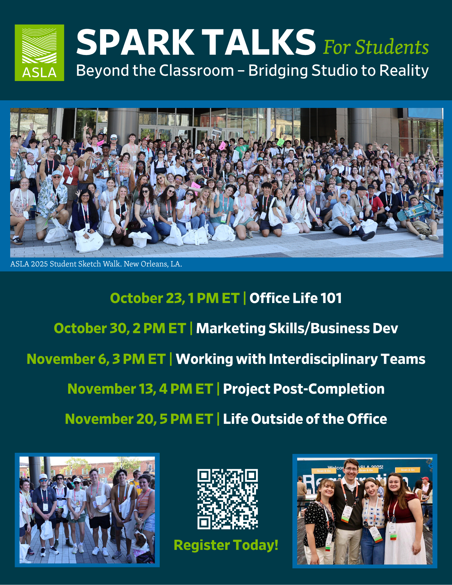 ASLA invites landscape architecture students to join Spark Talks: Beyond the Classroom – Bridging Studio to Reality, a dynamic five-part webinar series designed to help bridge the gap between academic learning and professional practice. Starting on October 23, these short, engaging conversations bring together emerging professionals—many of whom were students not long ago—to share their experiences, lessons, and insights about transitioning into the workforce.